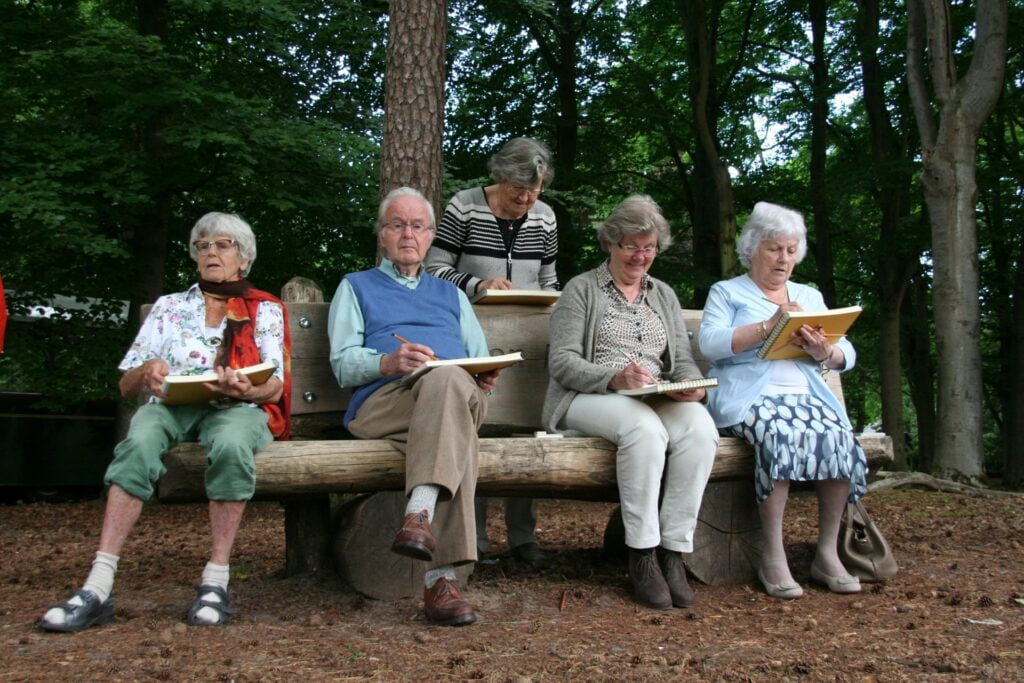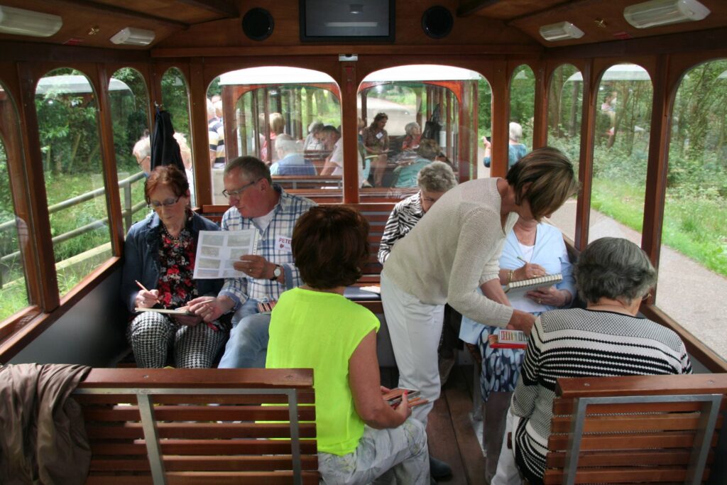 Soms biedt een andere omgeving inspiratie voor het beeldend bezig zijn. Daarom trekken onze cursisten met hun gasten er op uit in de Parel Express, ons mobiele atelier. Er wordt zowel in als buiten het treintje gewerkt en natuurlijk ontbreekt de Brabantse koffietafel niet.